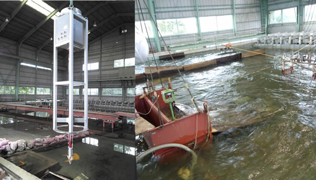 西さん達が進めている越波型は海の沖合に杭を打ち、傾斜板や水槽、放流管、発電機などの装置を固定する形式です。この方法は、傾斜板を乗り越えて貯められた波が下に落ちるときの勢いでプロペラを回して発電します。「他の波力発電に比べ、環境に影響を与えにくく、安定的に動かせるのが大きな特徴です」と西さんは越波型の利点を説明します。