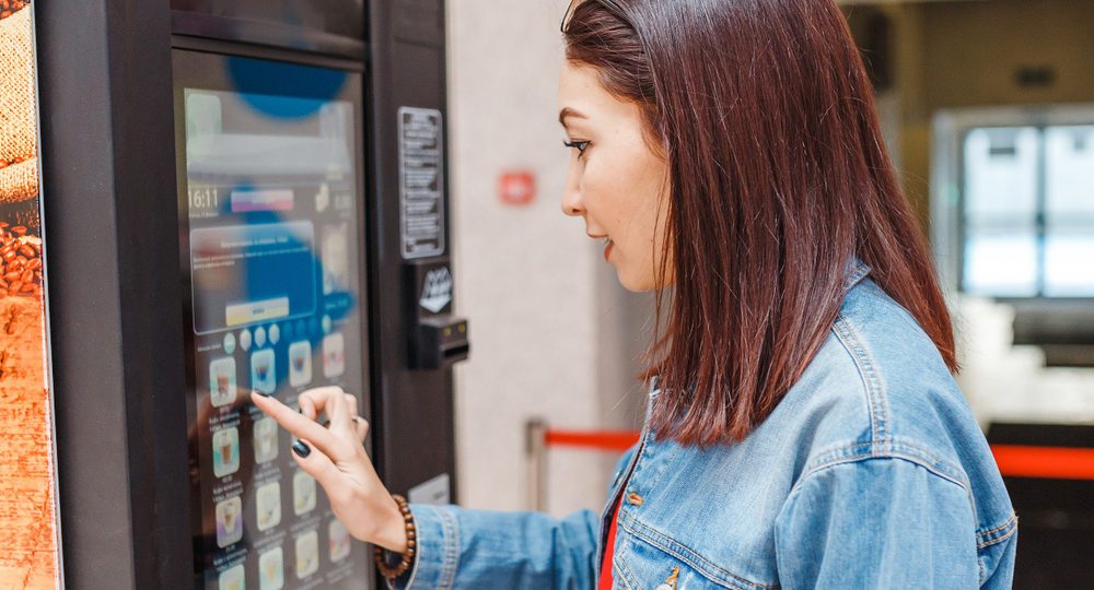 株式会社JR東日本ウォータービジネスは、2010年8月から、次世代自販機をJR東日本の駅に置いています。この自販機は電子看板(デジタルサイネージ)機能を持っていて、正面の上部にいろいろな画像を映すことができます。例えば、お客が飲み物を買うと「Thank you!」と表示します。また、近くに人がいるかを認識する機能もあるので、通常はおすすめ商品やキャラクターの顔などを表示していますが、前に人が立つと商品を表示します。