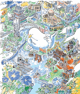 Landmarks such as the Atomic Bomb Dome, the Peace Memorial Park, and Hiroshima Castle are thoughtfully illustrated, reminding us of the city’s journey from devastation to rebirth. In the bay, a vermilion torii floats on the sea—an iconic image of Itsukushima Shrine, one of Japan’s three most scenic spots.