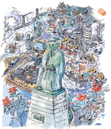 鰹で有名な高知の坂本龍馬像から、武家文化を今に伝える丸亀城や松山城まで、歴史と味わいが折り重なる四国の魅力が、賑やかに描かれています。
