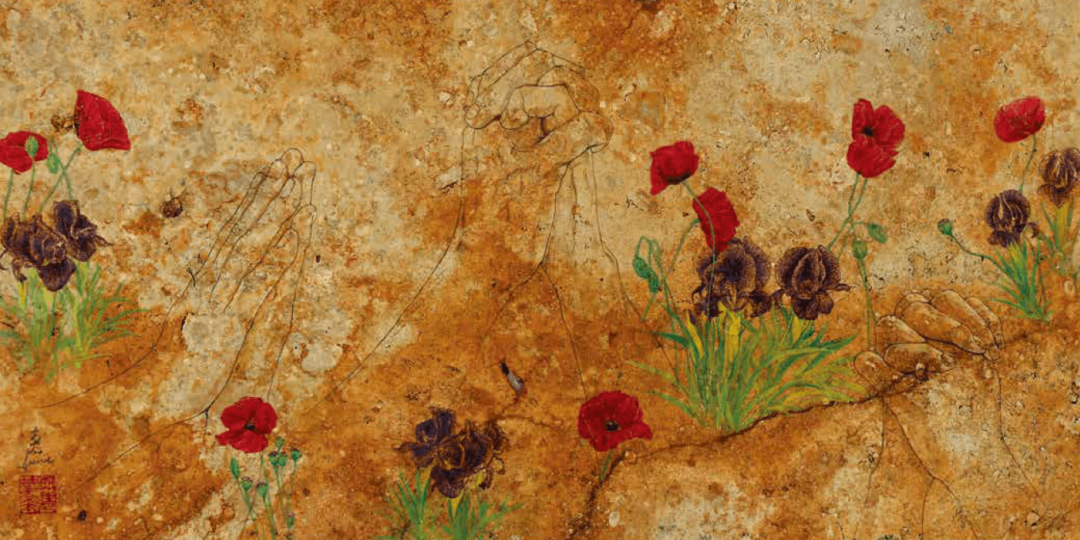 花の世界には壁はなく、たとえあろうと種は壁を越えて、共に自由に花を咲かせます。The artwork also depicts human hands praying alongside the flowers.