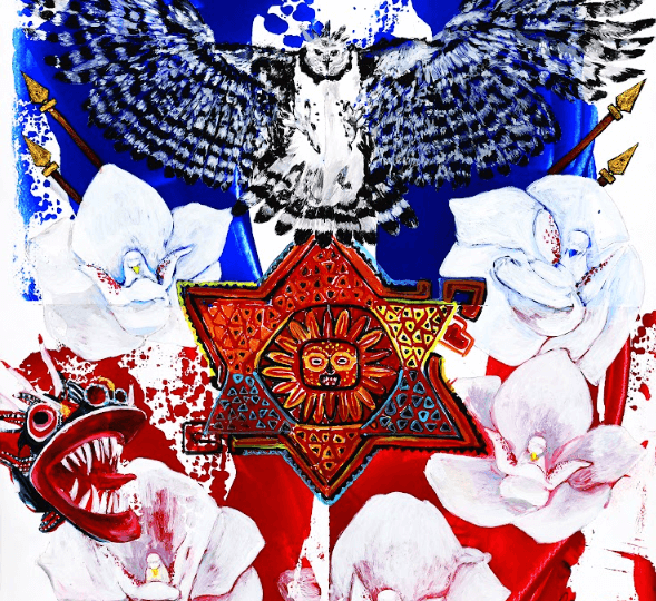 それを取り囲むパナマの国花エスピリトゥ・サント、別名「聖霊蘭[せいれいらん]」は、純白の花びらの中央に鳩が鎮座しているように見えるのが特徴です。背後には何本もの槍が平和と静寂を守るように力強く佇み、強靭と純粋が共存するパナマを示しています。