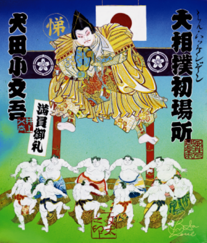 力士たちが円を描くように並び、その中央には南総里見八犬伝に登場する犬田小文吾が行司として立っています。