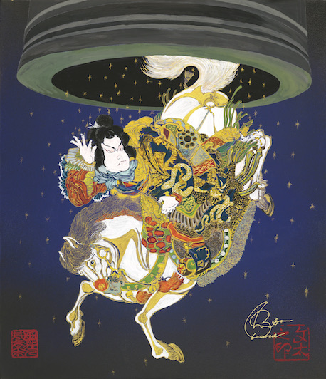 天馬に跨る侍の甲冑には、将門の流れを継ぐ相馬氏が代々掲げてきた九曜紋が輝き、宇宙の星々と共鳴しています。侍の衣には、前年の干支・巳が描かれ、時間の連続性や命のめぐり、歴史の重なりが静かに息づいています。