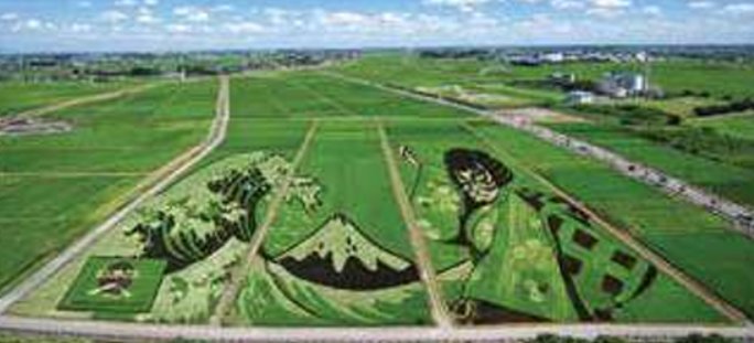 Tanbo art is to use those rice fields as a canvas and draw pictures or characters using rice plants of different colors.