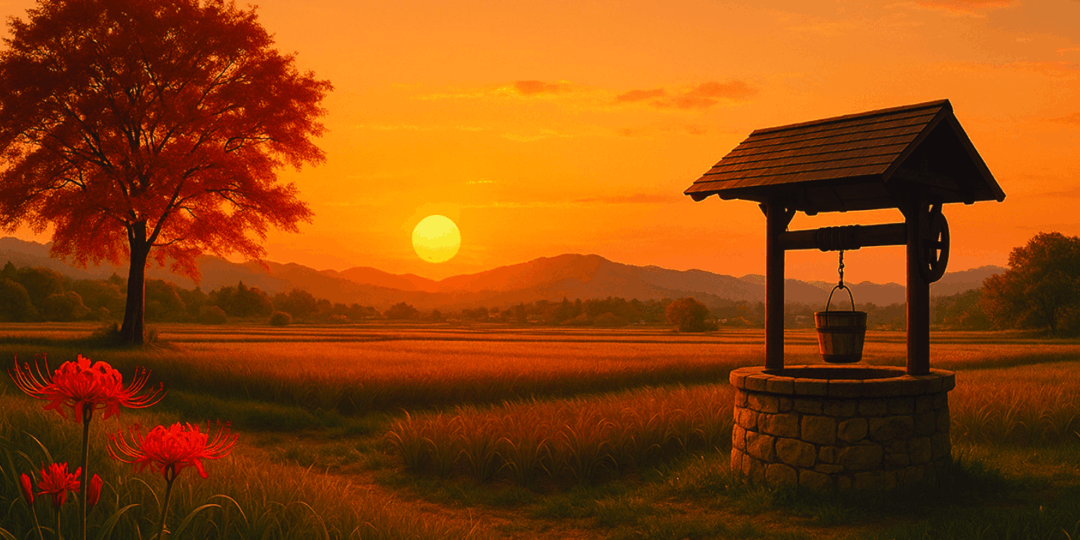 “Aki no hi wa tsurube otoshi” is a proverb that describes how quickly the day ends in autumn, with the sun setting suddenly. It compares this to the way a “tsurube”—a bucket used for drawing water from a well—drops straight and fast. In contrast to the slow, gradual sunsets of summer, it can be surprising in autumn how a sky that was bright just moments before suddenly darkens. The phrase is used not only to describe the early arrival of night but also as a metaphor for how things can come to an abrupt end.